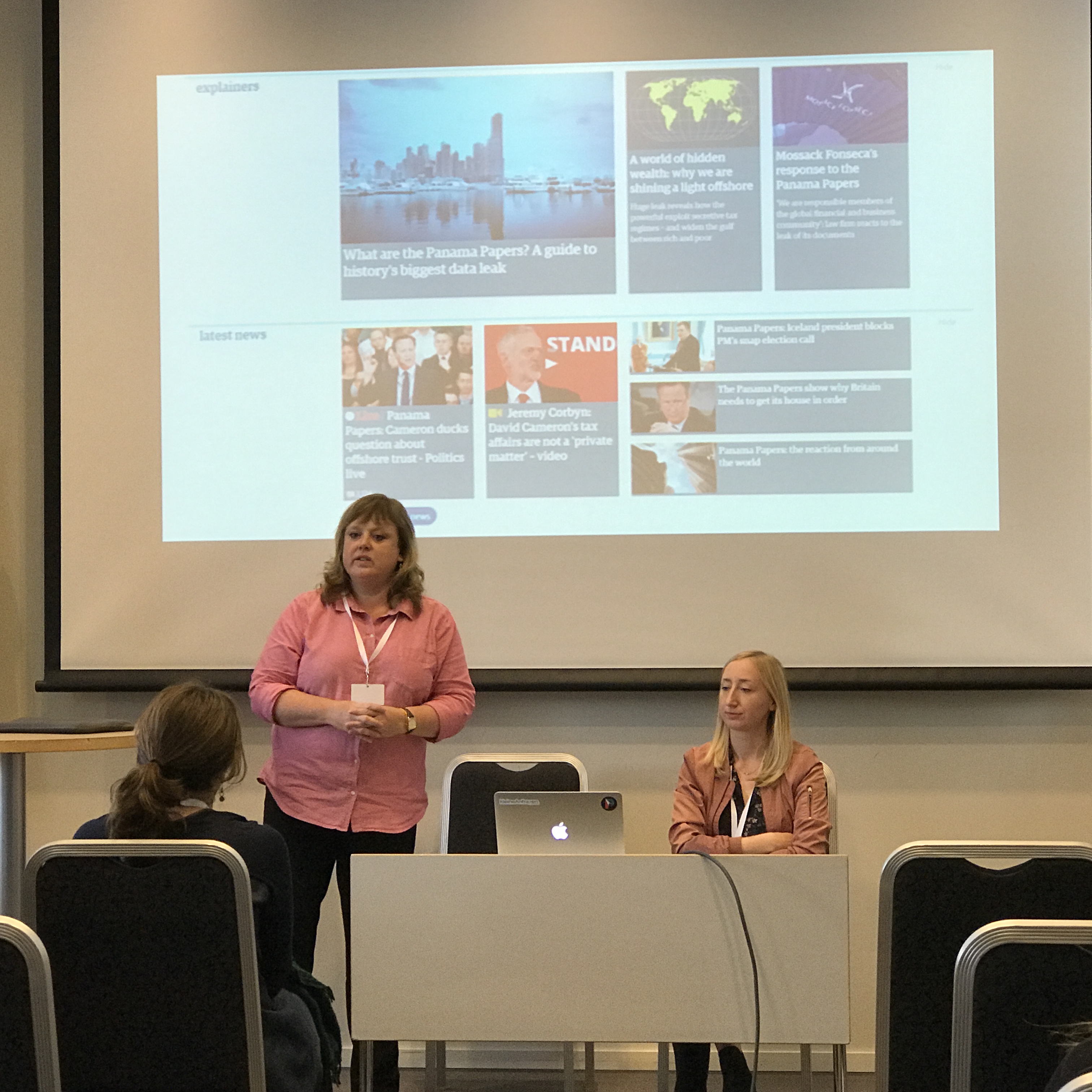 Isabelle Claire Valette forklarer hvordan hun gjorde statistisk analyse av funnene Synnøve Åsebø (t.v.) og Mona Grivi Norman gjorde i VGs psykiatriprosjekt.