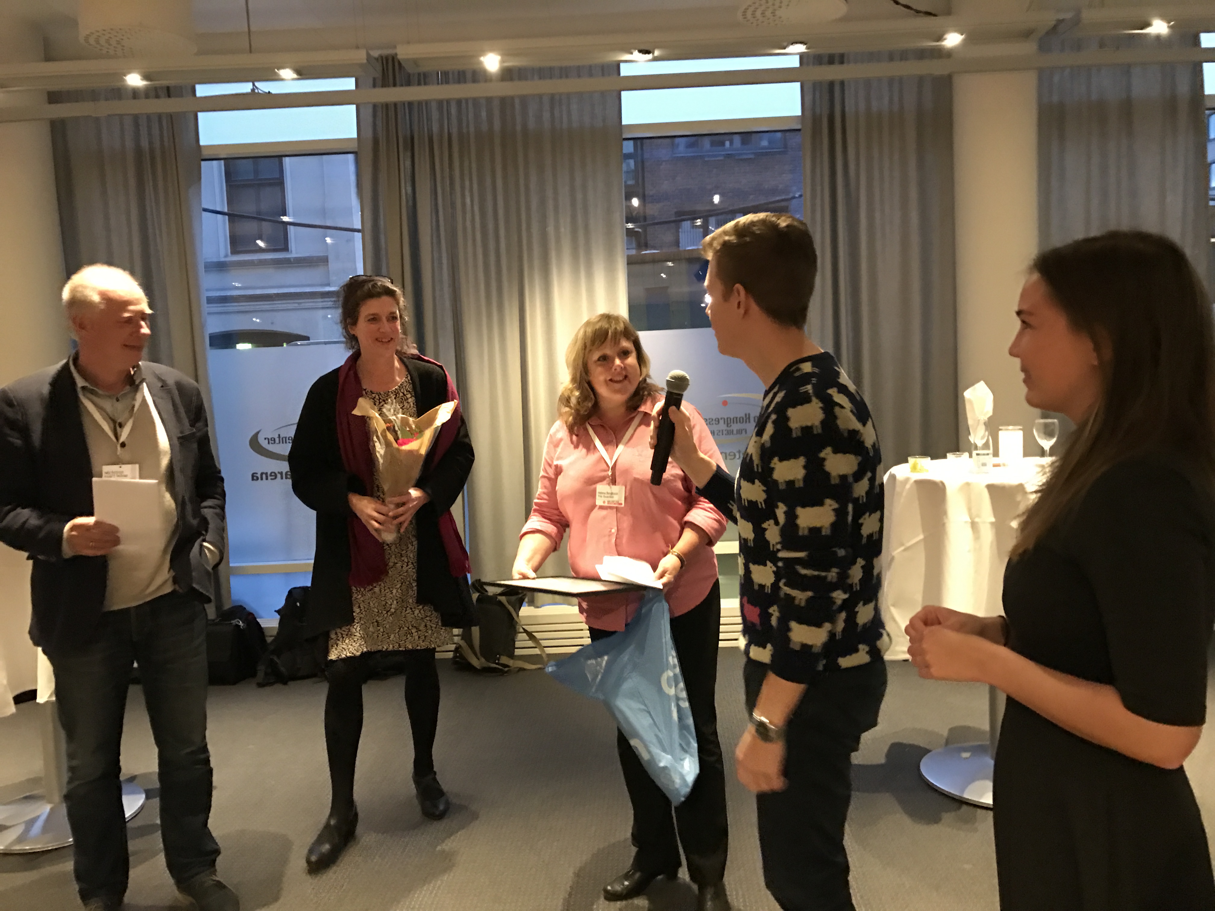 Prisvinnere: Juryen for Dataskup-prisen består av Nils Mulvad (f.v.), Brigitte Alfter og Helena Bengtsson. Her har de nettopp overrakt prisen til Einar Otto Stangvik og Natalie Remøe Hansen.