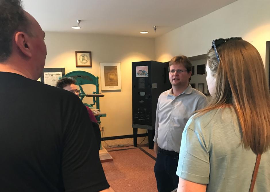 PÅ HJEMMEBANE: Adam Playford var i februar vertskap ved ett av bedriftsbesøkene Stup/SKUP gjennomførte i forbindelse med NICAR-konferansen. Her er han i samtale med Jan Gunnar Furuly og Marthe Susort Johannessen i redaksjonslokalene til Tampa Bay Times.
