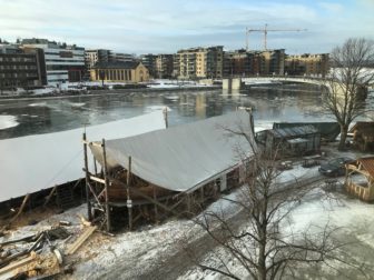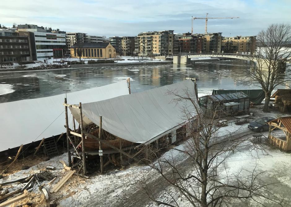 UTSIKTEN: Fra 3. etasje er dette utsikten mot kanalen og Kaldnes bro fra SKUP-hotellet Quality i Tønsberg. I forgrunnen er er Vikingodden, der det bygges nye vikingskip. Foto: John Bones