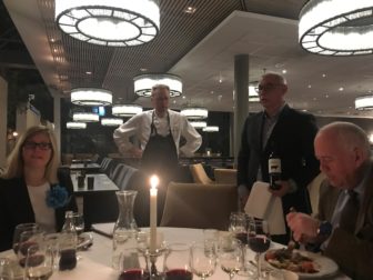 TROIKA: Sjefredaktør Sigmund Kydland i Tønsbergs Blad (t.h.) lar seg varte opp av en sentral troika på Hotel Quality under prøvesmakingen av årets gallamiddag på SKUP. Fra venstre hotellsjef Hege Halvorsen, kjøkkensjef Torbjørn Andersen og F&B Manager Kjell Skau. Foto: John Bones