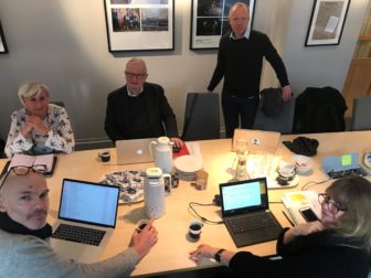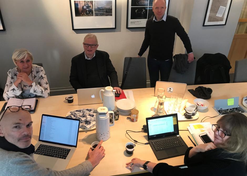 TREDJE MØTE: Onsdag hadde SKUP-juryen sitt tredje møte i Norsk Presseforbunds lokaler. Fra venstre Asbjørn Olsen, Tone Angell Jensen, juryleder Bernt Olufsen, Trond Sundnes og Vibeke Haug. Bjørn Sæbø og Linn Kongsli Hillestad var ikke tilstede da bildet ble tatt.